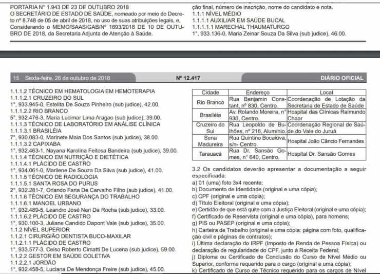 A Secretaria de Estado da Gestão Administrativa – SGA e a Secretaria de Estado de Saúde do Estado do Acre – SESACRE atendendo a determinação judicial publicou na edição do Diário Oficial do Estado (DOE) desta sexta-feria, 26, o edital de convocação (Nº 131/SGA/SESACRE) de candidatos aprovados em Concurso Público.