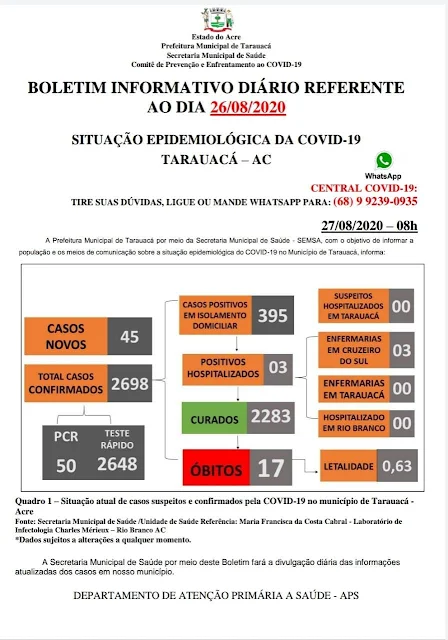 Página inicial TARAUACÁ: NOVOS CASOS E COVID 19 ELEVAM PARA 2698 O TOTAL DE TESTES POSITIVOS NO MUNICÍPIO João Rego 28 agosto 0 Facebook Twitter
