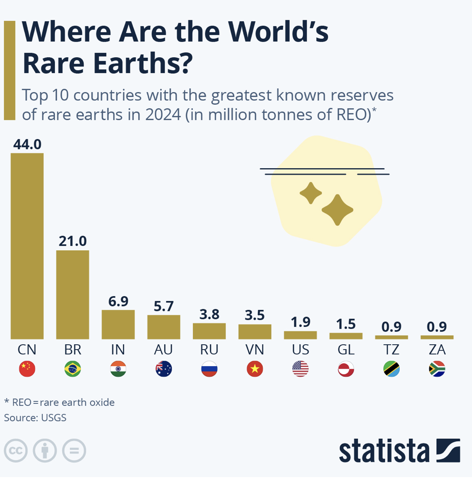 Segundo o US Geological Survey, o Brasil teria as segundas maiores jazidas de terras raras do mundo, pelo que se sabe até agora (vide gráfico abaixo).