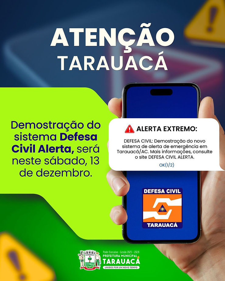 A Prefeitura de Tarauacá, por meio da Coordenadoria Municipal de Defesa Civil, comunica à população que no sábado, dia 13 de dezembro de 2025, serão realizadas duas importantes ações de prevenção e preparação para situações de risco: