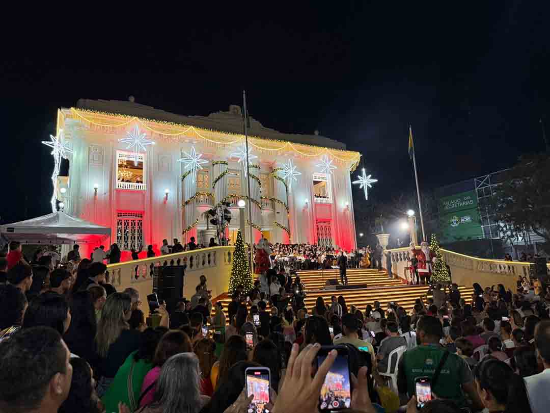 Com uma cantata e o acender das luzes de Natal, o governo do Acre deu início à programação natalina no Palácio Rio Branco na noite deste domingo (7). Ao abrir o evento, a vice-governadora Mailza Assis que “o Natal é um momento de celebração, festa, de nascimento”.